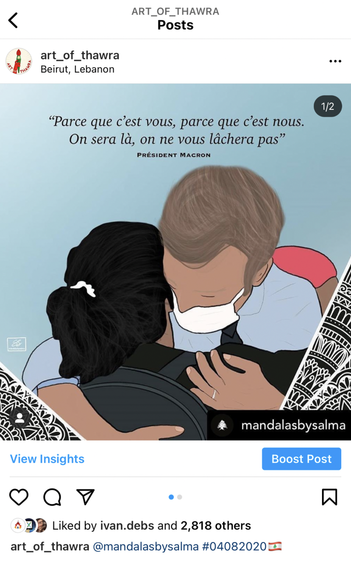 An event would happen, like french President Emanuel Macron’s visit, a moment would be captured in digital art and in less than an hour Art of Thawra would post it and circulate it on social media channels. They drew it while it’s hot and the platform spread it while it’s hot. click here to see the post in question.